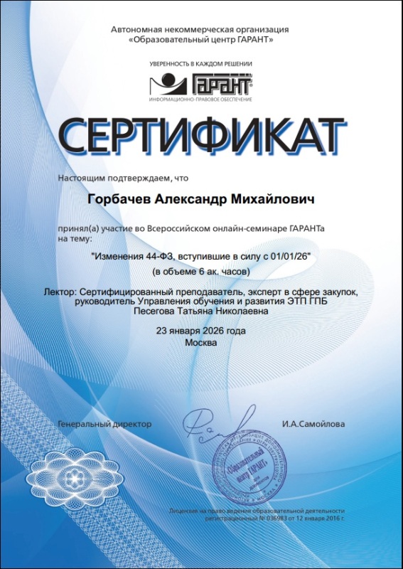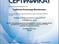 Сертификат участника Всероссийского онлайн-семинара по теме "Изменения 44-ФЗ, вступившие в силу с 01/01/2026"