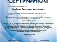 Сертификат участника Всероссийского онлайн-семинара на тему "Основания возникновения, порядок исполнения и способы пр...