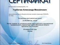 Сертификат участника Всероссийского онлайн-семинара по теме "Актуальные криптовалютные риски"