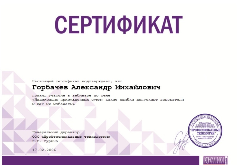 Сертификат участника Вебинара по теме: "Индексация присужденных сумм: какие ошибки допускают взыскатели и как их избе...
