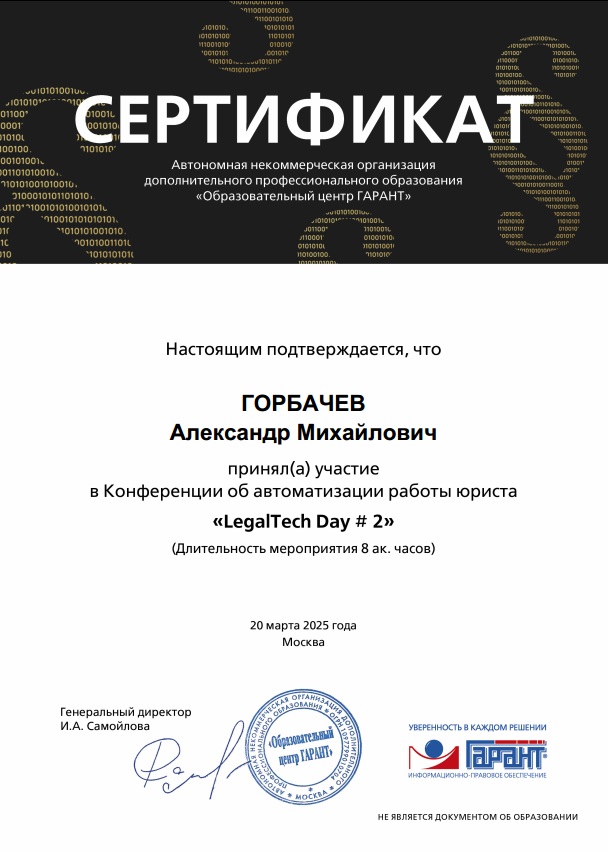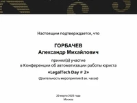 Сертификат участника конференции об автоматизации работы юриста "LegalTech Day # 2".
