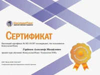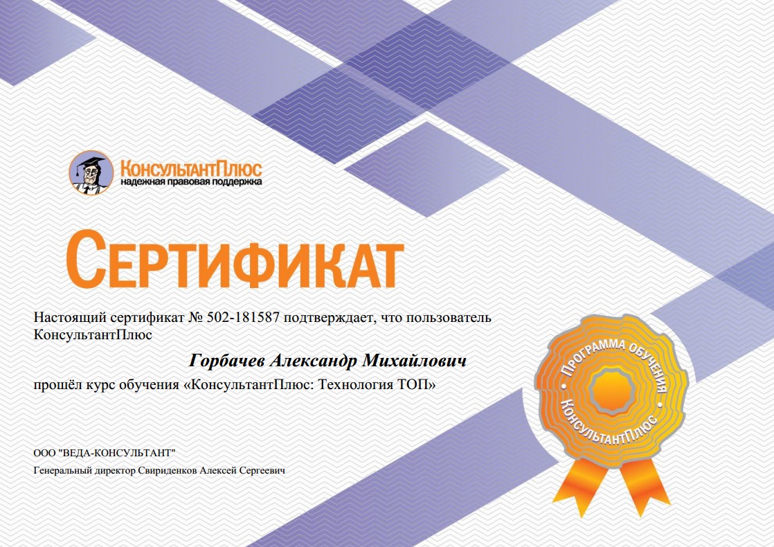Сертификат участника вебинара по теме "онсультантПлюс: Технологии ТОП".