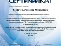 Сертификат участника Всероссийского онлайн-семинара на тему "Защита прав участников корпоративных отношений, взыскани...