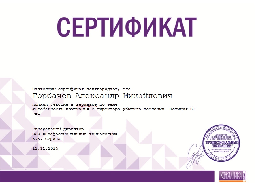 Сертификат участника вебинара по теме "Особенности взыскания с директора убытков компании. Позиция ВС РФ".